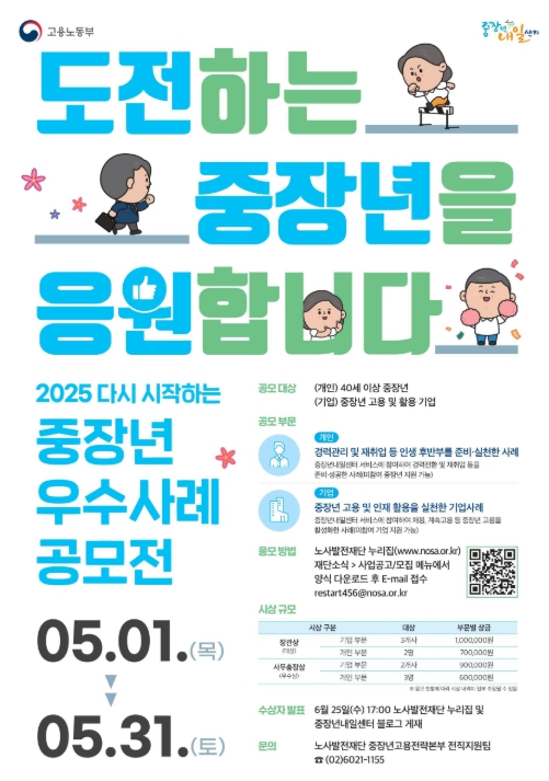 [우리집신문=감자] 노사발전재단(사무총장 박종필)은 고용노동부와 함께『2025년 다시 시작하는 중장년 우수사례 공모전』을 개최한다고 1일 밝혔다. 이번 공모전은 급변하는 노동시장에 대비해 경력 관리를 실천하고 있는 중장년의 사례와 중장년을 적극 활용한 기업 사례를 발굴하고 산업 현장에서 중장년 고용을 활성화하기 위해 2018년부터 매년 실시되고 있다. 참여 대상은 생애경력설계 및 경력전환 등에 성공한 40세 이상 중장년과 중장년 고용에 관심을 가지고 인재 활용에 앞장서는 기업이라면 가능하다. 시상 규모는 고용노동부 장관상 5점, 노사발전재단 사무총장상 5점 등 총 10점의 수상작을 선정해 장년고용 강조주간(9월 셋째 주)에 시상할 예정이다. 수상작은 영상 콘텐츠와 사례집으로 제작해 중장년내일센터를 통해 배포할 계획이다. 박종필 사무총장은 “이번 공모전을 통해 주된 일자리에서 얻은 경험과 지식, 기술을 바탕으로 새로운 도전에 나서는 중장년과 기업 현장에서 중장년을 적극적으로 활용하는 생생한 사례 등 다양한 우수사례가 발굴되길 바란다”라며, “특히 중장년층에게는 비슷한 연령대의 사례를 통해 자신감과 동기가 부여되고 기업에게는 중장년 활용 방안에 대한 해답을 찾을 수 있는 계기가 되기를 기대한다”라고 밝혔다. 공모 기간은 5월 1일부터 31일까지이며, 신청은 노사발전재단 누리집에 안내된 신청 양식에 따라 작성해 제출하면 된다.