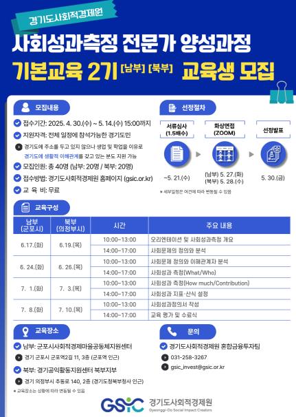 경기도사회적경제원, '사회성과측정 전문가 양성과정 기본교육' 교육생 모집6월 17일부터 4주간 경기 남부·북부 권역별 1회씩 운영