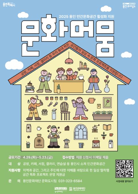 [우리집신문=감자] 용인문화재단은 오는 5월 23일까지 ‘2025 민간문화공간 활성화 지원사업 《문화머뭄》’에 참여할 공간을 모집한다. 《문화머뭄》은 카페, 공방, 갤러리 등 민간공간이 지역 거점 문화공간으로 성장할 수 있도록 돕는 사업이다. 지역성과 공간 특성을 반영한 시민 밀착형 프로젝트를 지원함으로써, 용인시 곳곳 시민들의 일상 속에서 다양한 문화가 스며들 수 있도록 할 계획이다. 2023년부터 2024년까지 2년간 경기문화재단의 ‘모든공간 31’과 협력해 용인의 크고 작은 40개 공간에서 문화 프로젝트 운영했으며, 이를 통해 누적 4,552명의 시민 참여를 이끌어 냈다. 올해는 재단 자체 재원을 매칭해 공간별 최대 300만원까지 프로젝트 운영비를 지원하며, 전년 대비 5개소가 늘어난 총 25개소를 선정할 예정이다. 특히, 지역 간 문화 불균형 해소를 위한 구별 차등 선발, 재단의 대표 사업인 찾아가는 예술교육 ‘당신의 앞마당까지 달려갑니다’ 프로그램과의 연계를 통한 민간 공간의 문화거점화 등, 다양한 직·간접적 지원을 통해 지역과 공간이 함께 성장할 수 있는 용인만의 특화된 민간문화공간 지원사업으로 확고히 자리잡을 것으로 기대된다. 지원 자격은 용인시에 소재한 카페, 공방, 서점, 갤러리 등 민간문화공간이며, 신청은 5월 23일 오후 6시까지 이메일을 통해 접수하면 된다. 또한, 참여 희망 공간운영자의 이해를 돕기 위해 5월 9일(금) 오후 8시 온라인 사업설명회를 개최할 예정이다.