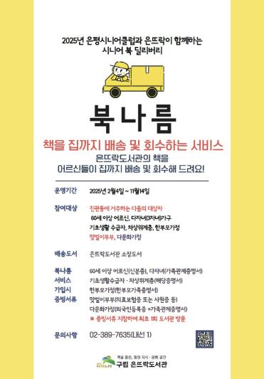[우리집신문=감자] 서울 은평구는 구립 은뜨락도서관에서 책을 집까지 배달하는 시니어 북 배송 서비스인 ‘북나름’을 운영한다고 밝혔다. ‘북나름’은 어르신들이 도서관의 책을 집까지 배송하고 회수하는 서비스로 은평시니어클럽과 협력해 진행한다. 참여 대상은 진관동에 거주하는 ▲다자녀(3자녀 이상)가구 ▲맞벌이 가구 ▲60세 이상 어르신 ▲기초생활 수급자 ▲차상위 계층 ▲한부모 가구 ▲다문화가정이다. 올해는 11월 14일까지 운영되며, 매년 2월부터 11월까지 시행될 예정이다. ‘북나름’ 서비스 신청을 원하는 참여 대상은 증빙 서류를 지참해 도서관에 최초 1번만 방문해 자격요건을 확인받고, 도서관 누리집을 통해 배송신청 하면 된다. 구립 은뜨락도서관 관계자는 “‘북나름’ 서비스를 통해 정보취약계층을 위한 독서 기회가 확대되고 어르신 일자리 확대에도 이바지할 것으로 기대된다”고 말했다.