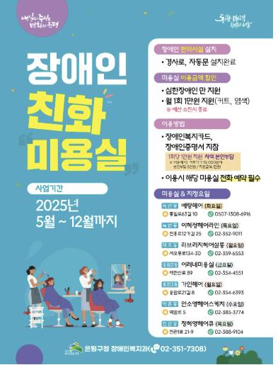 [우리집신문=감자] 서울 은평구는 지난 30일 사단법인 대한미용사회중앙회 은평구지회 미용실 7개소와 장애인친화미용실 운영을 위한 업무협약(MOU)을 체결했다고 밝혔다. 구는 ‘2025년 서울시 약자와의 동행 자치구 지원사업’ 공모에 장애인친화미용실이 선정돼 운영하게 됐다. 관내 지역을 7개 권역별로 구분해 민간 미용실을 장애인친화미용실로 선정하고, 미용실 출입에 불편이 없도록 경사로와 자동문 등 편의시설을 설치했다. 또한 친화미용실을 알리는 현판을 게시하며, 저소음 이미용기 등을 비치해 장애인의 미용실 이용 문턱을 낮추고 편의성을 높였다. 은평구에 등록된 ‘장애 정도가 심한’ 장애인은 월 1회 1만 원을 지원받아 미용서비스를 이용할 수 있다. 은평구 장애인친화미용실은 ▲응암3동 ‘가인헤어’ ▲대조동 ‘라브리지헤어살롱’ ▲역촌동 ‘안소영헤어스케치’ ▲녹번동 ‘예랑헤어’, ‘이혜정헤어라인’ ▲응암2동 ‘이레네미용실’ ▲진관동 ‘정혜영헤어큐’ 등 총 7개소가 지정됐다. 김미경 은평구청장은 “관내에서 장애인과 비장애인이 구분되지 않고 서로 소통하고 공감하며 모두를 포용하는 은평을 만들기 위해 최선을 다하겠다”고 말했다.