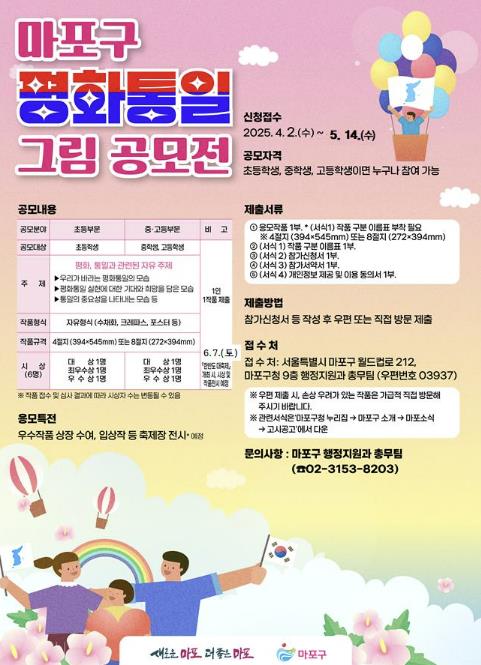 [우리집신문=감자] 마포구는 청소년들이 평화통일에 대한 관심과 감수성을 키울 수 있도록 ‘마포구 평화통일 그림 그리기 공모전’을 개최한다. 공모 주제는 ‘평화·통일’과 관련한 자유 주제로 ‘우리가 바라는 평화통일의 모습’, ‘평화통일 실현에 대한 기대와 희망을 담은 모습’ 등을 담아 4절지 또는 8절지 크기로 그림을 자유롭게 표현하면 된다. 전국 초·중·고등학생이면 누구나 참여할 수 있으며, 신청 기간은 5월 14일까지다. 작품은 마포구청 9층 행정지원과에 방문하거나 우편으로 제출하면 된다. 시상은 초등부문과 중·고등부문으로 나뉘며, 각 부문별로 대상 1명, 최우수상 1명, 우수상 1명씩 총 6명을 선정한다. 이번 공모전 6월 7일 홍대 레드로드 일대에서 열리는 ‘2025년 마포구 한반도 대축제’와 연계하여 진행된다. 우수작으로 선정된 작품들은 ‘2025년 마포구 한반도 대축제’ 당일 시상(상장)식을 열고, 레드로드 R5에 전시될 예정이다. 박강수 마포구청장은 "아이들의 작품 하나하나에 평화·통일에 대한 염원과 희망이 담겨 있다"라며, "그림을 통해 전해지는 메시지가 많은 이들의 마음에 울림을 주고, 더 나아가 통일 공감대 형성에 밑거름이 되길 바란다"라고 말했다. 한편, ‘마포구 한반도 대축제’는 6월 7일 레드로드 R5~R6 일대에서 열리며, 통일 염원 문화공연과 평화통일 체험부스 운영 등 다양한 행사가 펼쳐질 예정이다.