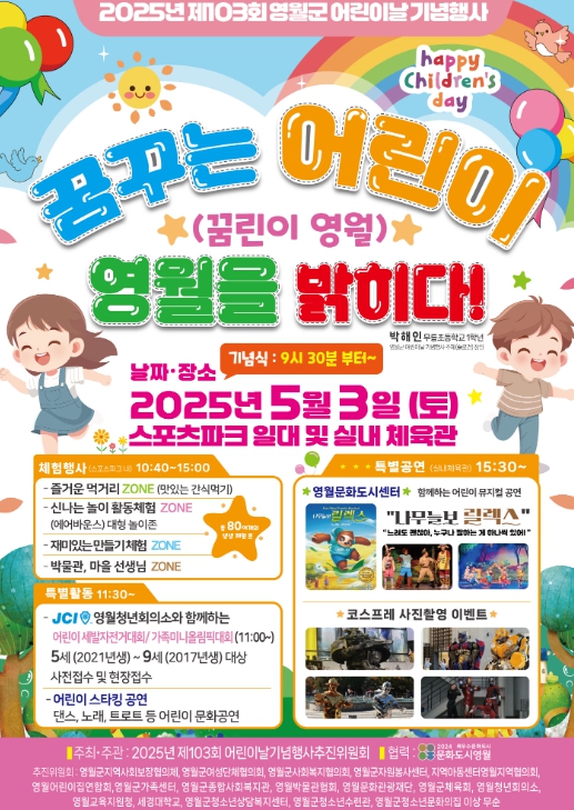 [우리집신문=감자] 영월군은 제103회 어린이날을 맞아 오는 5월 3일 오전 10시부터 오후 4시까지 영월 스포츠파크 실내체육관에서 다채로운 기념행사를 개최한다. “꿈꾸는 어린이, 영월을 밝히다”를 주제로 열리는 이번 행사는 어린이와 가족 2,000여 명이 참여하는 대규모 축제로 기획됐다. 행사는 식전 응원(치어리딩) 및 합창공연을 시작으로, 기념식과 모범어린이 시상, 축하공연, 체험부스, 어린이 장기자랑, 특별공연(뮤지컬) 등으로 구성된다. 특히 70여 개의 체험 및 먹거리 부스와 함께 에어바운스, 세발자전거 대회 등 아이들을 위한 놀이가 운영되어 가족 모두가 즐길 수 있는 시간을 제공할 예정이다. 영월군 관계자는 “어린이날을 맞아 모든 어린이가 꿈과 웃음을 키우는 하루가 되길 바란다.”라며 “가족이 함께 행복한 시간을 보내는 축제가 되도록 하겠다.”라고 전했다.