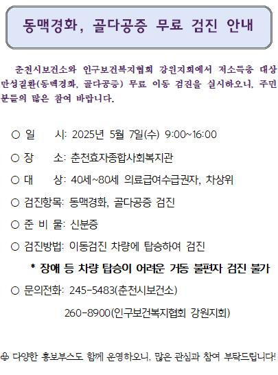 [우리집신문=감자] 춘천시보건소는 인구보건복지협회 강원지회와 함께 오는 5월 7일, 저소득층 대상 만성질환 무료 이동검진을 실시한다고 밝혔다. 이번 이동검진은 만성질환의 조기 발견과 건강 사각지대 해소를 위한 사업으로, 의료급여수급권자 및 차상위 중 40세부터 80세까지의 주민들을 대상으로 진행된다. 검진은 오전 9시부터 오후 4시까지 효자종합사회복지관에서 실시되며, 검사 항목은 동맥경화 검사와 골다공증 검사로, 사전에 별도의 준비 없이 신분증만 지참하여 방문하면 무료로 검진을 받을 수 있다. 검진 당일에는 검진 외에도 질병 예방을 도모하기 위한 손씻기 체험 및 구강관리교육, 심뇌혈관 예방관리 캠페인 홍보부스가 함께 운영될 예정으로 주민들의 건강 인식 제고에도 기여할 것으로 기대된다. 보건소 관계자는 “만성질환에 취약한 저소득층 주민들이 이번 기회를 통해 건강 상태를 점검하고 질병을 조기에 예방할 수 있기를 바란다”며, “다양한 홍보부스도 준비되어 있으니 많은 주민분들의 관심과 참여를 부탁드린다.“고 전했다.