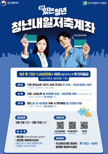 [우리집신문=감자] 부천시는 5월 2일부터 5월 21일까지 일하는 저소득 청년의 경제적 자립을 지원하는 ‘청년내일저축계좌’ 신규 가입자를 모집한다. 신청 대상은 기준 중위소득 100% 이하 가구에 속한 일하는 청년으로, 연령, 소득, 가구 기준을 모두 충족해야 하며, 가구소득에 따라 가입 요건이 달라진다. 기준 중위소득 50%를 초과하고 100% 이하인 경우, 신청 당시 만 19세 이상 만 34세 이하 청년이 대상이며, 근로 또는 사업소득이 월 50만 원을 초과하고 250만 원 이하여야 한다. 3년 동안 매월 10만 원 이상 저축하면 정부가 매월 10만 원을 추가 지원해 만기 시 총 720만 원(본인 저축 360만 원 포함)과 이자를 받을 수 있다. 기준 중위소득 50% 이하인 경우, 신청 당시 만 15세 이상 만 39세 이하 청년이 대상이며, 근로 또는 사업소득이 월 10만 원 이상이어야 한다. 3년 동안 매월 10만 원 이상 저축하면 정부가 매월 30만 원을 추가 지원해 만기 시 총 1,440만 원(본인 저축 360만 원 포함)과 이자를 받을 수 있다. 만기 해지를 위해서는 △근로·사업활동 지속 및 근로활동 없을 시 적립금 환수 △3년간 본인적립금 납부 △소득기준 충족 △자립역량교육 10시간 이수 △자금사용계획서 제출 요건을 모두 충족해야 한다. 가입 희망 대상자는 5월 21일까지 관할 행정복지센터를 방문하거나 ‘복지로’ 홈페이지를 통해 온라인으로 신청할 수 있다. 이번 사업은 예산 상황에 따라 변동될 수 있으며, 예산이 소진될 경우 적립금 지급이 중단될 수 있다.