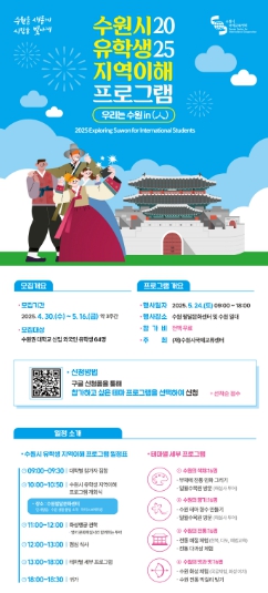 수원시국제교류센터가 ‘우리는 수원 in(人)-2025 수원시 유학생 지역이해 프로그램’ 참가자 모집5월 24일 수원권 대학교 신입 유학생 64명 대상, 화성행궁 견학 등