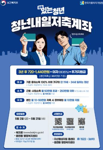 청년내일저축계좌 신청을 희망하는 청년은 이달 21일까지 주소지의 읍‧면사무소에 방문하여 신청하거나 복지로 누리집에 접속하여 온라인으로 신청할 수 있다.