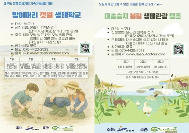 [우리집신문=감자] 안산시는 천혜의 자연경관을 가진 대부도를 체험할 수 있는 ‘방아머리해변 갯벌생태학교’와 ‘대송습지 철새탐조 프로그램’ 참여자를 선착순으로 모집한다고 14일 밝혔다. 방아머리해변 갯벌생태학교는 생태계 환경보전의 중요성과 생태계 보전 실천의 중요성을 알리는 프로그램이다. 프로그램에서는 갯벌에 살고 있는 생물을 관찰하고, 방아머리 해변에서 플로깅 활동을 병행한다. 자원봉사시간 1시간도 함께 부여된다. 12일 접수를 시작한 이번 프로그램은 15명 이내로 선착순 마감된다. 참가비는 무료다. 오는 18일에 첫 프로그램을 시작해 오는 8월까지 총 26회 프로그램(6월~8월까지 회차당 2회씩 진행)이 운영된다. 아울러, 시는 130여 종의 조류가 서식하는 서해안 최대 습지인 ‘대부도 대송습지 철새탐조’ 프로그램 참여자도 함께 모집한다. 프로그램에서는 광활한 습지를 구경하고, 습지에 서식하는 철새의 생태를 필드스코프와 쌍안경을 이용해 관찰하고 기록한다. 대송습지 생태관광 탐조활동은 오는 17일을 시작으로 9월과 10월, 12월까지 총 17회 운영할 예정이다. 모집은 15명 이내로 선착순 마감되며 참가비는 무료다. 두 가지 프로그램 모두 안산시생태관광 누리집에서 온라인으로 접수하면 된다.