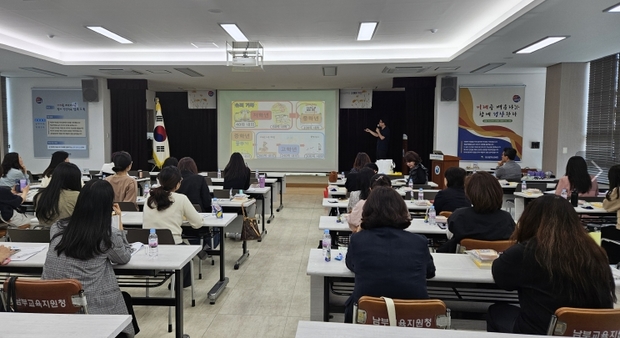 [우리집신문=감자] 대구남부교육지원청은 5월 13일 남부교육지원청 대회의실에서 관내 초등학교 교사 41명을 대상으로 ‘학급경영 전문가와 함께하는 수업 대화(이하 수업 대화)’를 운영했다. 이 프로그램은 학생 성장과 교실수업 개선을 지원하는 남부교육지원청 특색사업 ‘초등 팝콘 프로젝트’의 하나로, 학급경영 전문가의 사례 나눔을 통해 학생주도수업의 실천적 방향을 안내했다. 이번 수업 대화에서는 ‘책과 함께하는 학급경영’을 주제로 경북 삼성현초등학교 정연우 교사가 강연을 맡았다. 정 교사는 ▲초등학교의 독서 현실 알기, ▲부담 없이 책과 가까워지는 5가지 방법, ▲그림책 읽어주기에 관한 질의응답, ▲도서관을 더 재미있게 다니는 10가지 방법 등을 소개하며 참가 교사들과 함께 독서지도 현장의 고민과 해결 방안을 나누는 소통의 시간을 가졌다. 특히, 정 교사는 자신의 현장 경험을 바탕으로 직접 제작한 독서메모지를 활용한 실습을 진행해 참석 교사들이 수업에 즉시 적용할 수 있도록 했다. 또한 학급경영과 수업의 연결고리를 찾을 수 있는 교실수업 개선 관련 도서도 참석자들에게 제공됐다. 류호 교육장은 “이번 수업 대화를 통해 교사들이 교육 현장에서의 고민을 함께 나누고 수업 역량을 키워 학생 주도성을 신장시키는 출발점이 되길 바란다.”며, “앞으로도 교사와 학생이 함께 성장하는 교육이 이뤄질 수 있도록 적극 지원하겠다.”고 말했다.