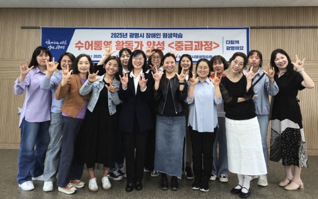 [우리집신문=감자] 광명시는 14일 광명시 평생학습원에서 ‘장애인 평생학습 수어통역 활동가 양성 중급과정’ 수료식을 개최했다. 이번 과정은 청각장애인의 평생학습 참여를 지원하고, 지역 내 수어통역 인력자원을 확보하기 위해 마련했다. 수어에 능통하고 청각장애를 이해하는 통역 활동가를 양성하는 것이 목적이다. 교육은 3개월간 총 15회 진행했으며, 음성언어를 전면 배제하고 시각언어 중심의 수어 어휘와 문장 표현 교육에 집중했다. 총 10명의 수강생이 교육과정을 마치고 수료증을 받았다. 한 수료생은 “기존의 단순 암기식 수어 교육이 아니라, 1:1 소통 방식으로 몸으로 익힐 수 있었던 점이 인상 깊었다”며 “배운 수어를 꾸준히 연습해 청각장애인에게 실질적인 도움을 주는 활동가로 성장하고 싶다”고 소감을 전했다. 황희민 평생학습사업본부장은 “이번 교육이 장애와 비장애의 경계를 허물고, 모두가 함께 소통하는 지역사회를 만드는 밑거름이 되길 바란다”며 “수료생들이 익힌 수어 역량을 다양한 현장에서 지속적으로 활용할 수 있도록, 동아리 활동이나 자원봉사, 후속 교육 기회를 적극 지원하겠다”고 말했다. 한편, 광명시는 이번 수료생을 대상으로 교육부 국립특수교육원이 주관하는 ‘2025년 장애인 평생학습도시 운영사업(특성화 지원)’의 일환으로 ‘수어통역 활동가 양성 인큐베이팅’ 후속 과정을 이어갈 예정이다.