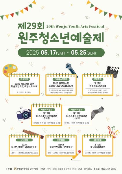[우리집신문=감자] (사)한국예술문화단체총연합 원주지회는 오는 17일부터 25일까지 ‘제29회 원주 청소년예술제’를 개최한다. 청소년예술제는 지역 청소년들이 창의적이고 다양한 예술 활동을 통해 자신의 재능을 펼치는 특별한 기회를 제공하기 위해 마련됐다. 특히, 이번 예술제는 청소년들이 직접 참여하고 주도하며 예술적 열정을 마음껏 드러낼 수 있는 무대로 꾸며졌다. 단순한 관람을 넘어 자신만의 작품을 선보이며 예술적 자율성을 기르고 청소년들이 각 분야의 창작 과정에 적극적으로 참여함으로써 더 큰 창의적 성취를 경험할 수 있을 것으로 기대된다. 예술제는 어울림마당, 박경리문학공원, 치악예술관 등 원주 대표 문화공간에서 진행되며, 문학·연예예술·국악·음악·미술·연극·사진 등 7개 분야 프로그램을 통해 청소년들에게 다양하고 풍성한 예술 세계를 보여줄 예정이다. 주요 행사로는 ▲청소년 트로트·가요·댄스 페스티벌(17일) ▲청소년을 위한 미술체험과 건축양식의 이해(17일) ▲청소년연극제(20∼23일) ▲청소년사진공모전전시회(20∼25일) ▲청소년, 행복한 국악을 만나다(21일) ▲치악산전국청소년백일장(24일) ▲학생음악콩쿠르(24일) 등이 열린다. 박혜순 문화예술과장은 “원주 청소년예술제가 지역 청소년들에게 예술의 문을 두드릴 수 있는 계기가 되고, 나아가 자신만의 예술 세계를 발견하는 소중한 시간이 되길 바란다.”라고 전했다.
