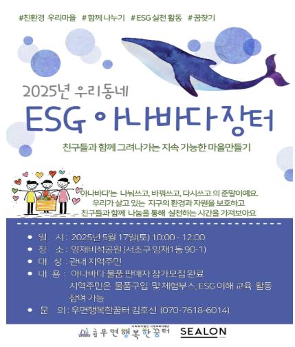 서초 행복한 꿈찾기 사업, 'ESG 아나바다' 행사 개최친환경 물품 제작, 환경보호 슬로건과 굿즈 제작, 인생네컷 포토존, 아나바다 장터 등으로 구성