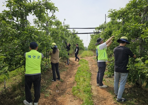 예산군 관광시설사업소, 냉해피해 입은 과수농가 찾아 농촌일손돕기 추진이상기후 피해 속 사과 적과 작업 지원… 농가에 따뜻한 위로 전해