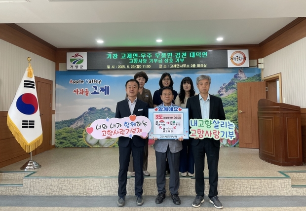 [우리집신문=감자] 무주군 무풍면이 고향사랑기부제 활성화와 지역 상호 발전을 위해 150만 원을 경남 거창군 고제면에 기부하며 경북 김천시 대덕면, 경남 거창군 고제면과 함께 하는 고향사랑기부금 상호 기부에 동참했다. 이번 상호 기부는 대덕산을 중심으로 동서 화합을 도모해 온 3도(전북, 경북, 경남) 3면(무풍, 대덕, 고제)이 매년 '만남의 날' 행사를 통해 인적·물적 교류를 진행하며 얻은 결실로, 지역 간 경계를 넘은 △상호 협력과 연대, △고향사랑기부제 활성화, △지역소멸 위기 대응, △공동체 의식 함양이라는 측면에서 주목을 받고 있다. 서종열 무풍면장은 "이번 교차 기부가 3도 3면 협력의 원동력이 되기를 바란다"라며, "3도 3면 교류가 앞으로도 주민 행복의 든든한 버팀목이 될 수 있도록 다양한 활동을 이어 나갈 것"이라고 밝혔다. 한편, 3도 3면 만남의 날은 ’98년 무풍면과 고제면 이장대표가 먼저 상호교류 협정을 체결하며 시작됐으며 ‘99년 대덕면까지 3개 면 이장단이 뜻을 모으며 완전체가 돼 만남의 날을 이어오고 있다. 이들은 △지역 화합의 목표 아래 상호 교류·주민화합, △정보교환, △소득증대와 지역발전을 위해 적극 협력하고 있다.