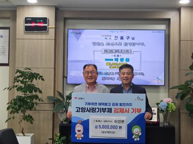 [우리집신문=감자] 김제시는 ㈜토페스 이강본 대표가 3일 고향사랑기부금 500만 원을 기탁했다고 밝혔다. ㈜토페스는 국내 최초 무인 교통단속 시스템과 영상식 차량검지기 등 개발에 성공한 회사로 교통단속 및 정보시스템을 전문으로 하는 기업이며 2024년에 김제시 지능형 교통시스템(ITS) 구축사업을 추진한 바 있다. 시는 고향사랑기부로 조성된 기금을 활용하여 2024년 사업으로 '치매 어르신 인공지능 돌봄 인형 지원 사업'과 '청년 근로자 출·퇴근 교통비 지원 사업'을 선정하여 추진했으며 2025년에는 '소상공인 1인점포 안심벨 지원사업'과 '지역아동센터 고향사랑 리모델링 사업' 및 '김제형 마을자치연금 지원사업'을 추진한다. 이 대표는 “고향사랑기부를 통해 김제시 발전에 작은 보탬이 될 수 있어 기쁘다”며 “앞으로도 기업 성장과 함께 지역 발전 및 취약계층 지원 등을 위한 사회 공헌 활동도 지속적으로 이어 나가겠다.”라고 말했다. 정성주 김제시장은 “김제시 발전을 위하여 고향사랑기부제에 동참해 주신 이강본 대표에 감사드린다.”며 “소중한 기부금은 지역 발전과 주민 복리 증진 등을 위한 다양한 사업에 투명하게 활용하겠다.”고 말했다. 한편, 고향사랑기부제는 개인이 주소지 외에 지방자치단체에 연간 2,000만 원 이하의 금액을 기부하면 세액공제와 함께 30%의 답례품을 받는 제도로, 기부 영수증을 별도 제출하지 않아도 연말정산 간소화 서비스에 자동 반영된다.