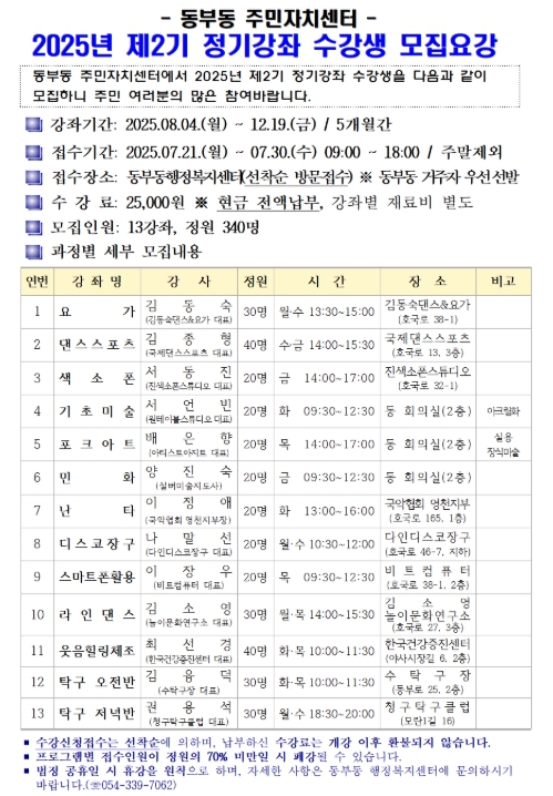 [우리집신문=감자] 영천시 동부동 주민자치위원회는 7월 21일부터 30일까지 2025년 제2기 정기강좌 수강생을 모집한다고 밝혔다. 모집강좌는 △요가(30명) △댄스스포츠(40명) △색소폰(20명) △기초미술(아크릴화)(20명) △포크아트(실용장식미술)(20명) △민화(20명) △난타(20명) △디스코장구(20명) △스마트폰활용(20명) △라인댄스(30명) △웃음힐링체조(40명) △탁구 오전반(30명) △탁구 저녁반(30명)으로, 총 13개 강좌, 340명을 모집한다. 자세한 모집요강은 영천시청 홈페이지에서 확인할 수 있다. 수강신청은 접수 기간 내 동부동 행정복지센터로 선착순 방문 접수하면 되며, 수강료는 25,000원/5개월(재료비 등 별도)이다. 최종윤 주민자치위원장은 “동부동 주민자치센터를 통해 동부동 주민 여러분께 더욱 만족도 높은 배움의 기회를 제공할 수 있도록 최선을 다하겠다”고 다. 조남철 동부동장은 “다양한 주민들의 선호도를 반영해 좋은 강좌를 개설해 주신 주민자치위원회의 노고에 감사드리며, 강좌 운영이 원활히 이뤄질 수 있도록 적극 지원하겠다”고 말했다.