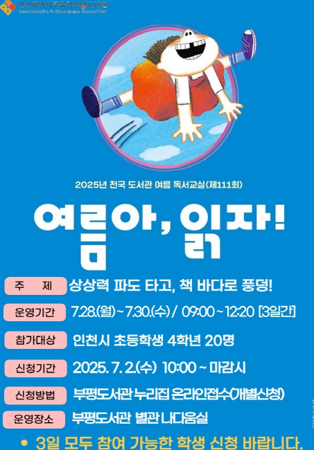 [우리집신문=감자] 인천광역시교육청부평도서관은 7월 28일부터 30일까지 초등학교 4학년 20명을 대상으로 ‘2025년 제111회 여름 독서교실’을 운영한다. 이번 독서교실은 ‘상상력 파도 타고, 책 바다로 풍덩!’을 주제로 ▲도서관이 살아있다 ▲책 속 바다로 풍덩! ▲상상 가득한 세상! ▲팝아트 액자 만들기 ▲나만의 컬러 방향제 만들기 ▲책 속 장면 역할극 등 독서와 연계한 체험 중심 프로그램을 진행한다. 수업은 도서관 별관 나다움실에서 진행되며, 참가 신청은 7월 2일(수) 오전 10시부터 부평도서관 누리집에서 할 수 있다. 자세한 사항은 부평도서관 어린이자료실로 문의하거나, 누리집을 참고하면 된다.