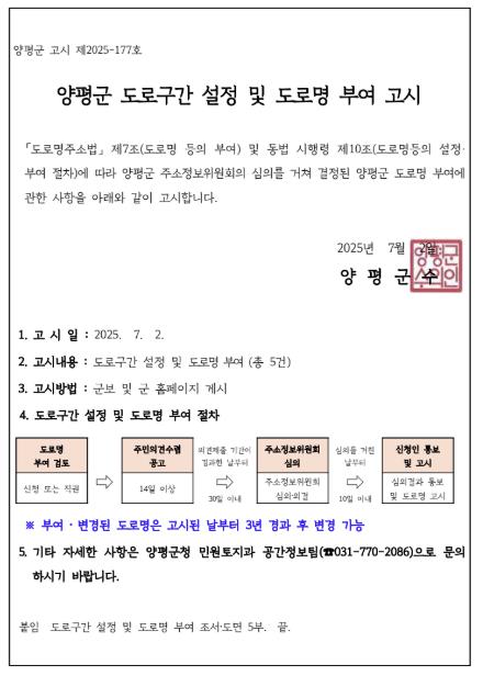 [우리집신문=감자] 양평군은 공원과 산책로 5곳에 도로명주소를 신규 부여했다. 기존의 공원과 산책로는 비거주지역으로 주소 정보가 부족하여 정확한 위치를 파악하기 어려웠다. 이러한 문제를 해결하고, 군민과 방문객의 안전과 편리성을 향상하기 위하여 이번에 도로명주소가 부여됐다. 이를 위하여 양평군은 관계 기관과 군민의 의견을 구하고, 현장 조사를 거친 뒤, 6월 23일부터 26일까지 진행된 양평군 주소정보위원회 심의를 거쳐 도로구간과 도로명을 최종결정했다. 이번에 부여된 주소는 다음과 같다. 양강섬안길(△양근리 497-2 ~ 479-8), 오빈강변산책길(△오빈리 521 ~ 538), 강하예술공원안길(△전수리 1035-9 ~ 998-13), 강하수변공원안길(△운심리 560 ~ 69-3), 복포강변산책길(△복포리 444 ~ 168-6). 도로명은 해당 공간의 지리적 위치와 특성을 반영하여 누구나 쉽게 위치를 알 수 있도록 부여됐다. 예컨대 “OO안길”은 공원 또는 섬 내부에 있는 길을, “OO산책길”은 지명과 지형에 기반한 산책로라는 점을 명확히 드러낸다. 이처럼 도로명주소가 없던 공간에 도로명주소를 부여함으로써 응급상황 발생 시 신속한 대응, 내비게이션 안내, 시설물 관리 등 다양한 생활 편의성이 크게 향상될 것으로 기대한다. 전진선 양평군수는 “군민들이 자주 찾는 공원과 산책로에 도로명주소가 생겨 더 편리하고 더 안전해졌다. 앞으로도 공원, 산책로, 등산로 등 비주소지역에 도로명주소를 확대 부여해 군민의 편의성과 안전을 높이고, 촘촘한 주소체계를 지속적으로 구축해 나가겠다.”라고 말했다.