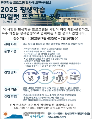 [우리집신문=감자] 서귀포시는 역량 있는 강사와 새로운 교육 콘텐츠를 발굴하고, 시민이 직접 참여하는 평생학습 기반을 넓히기 위해 ‘2025년 서귀포시 평생학습관 파일럿 과정 공모’를 7월 4일(금)부터 16일(수)까지 진행한다. 서귀포시는 이번 공모를 통해 총 5개 내외의 과정을 선발할 예정이며, 강사 활동을 희망하는 성인 누구나 1인 1과정에 한해 총 16시간의 범위(자격취득과정은 24시간)로 교육 주제, 운영 방식, 장소 등을 자유롭게 신청할 수 있다. 제출된 강의계획서 등을 바탕으로 7월 중 서류 심사를 통해 선정하고, 8월에는 수강생을 모집한 후 9월부터 11월까지 시범 운영할 예정이며, 운영 결과가 우수한 과정은 수료율과 만족도 등을 종합 평가하여 2026년 평생학습관 정규 프로그램으로의 편성을 검토할 계획이다. 서귀포시 관계자는 “이번 파일럿 과정 공모는 시민의 다양한 학습 수요를 반영하고, 지역 강사들의 활동 기회를 넓혀 평생교육 인적자원 저변을 확대하는 계기가 될 것”이라며, “참신한 아이디어와 교육 역량을 갖춘 시민 여러분의 적극적인 참여를 기대한다”라고 말했다.
